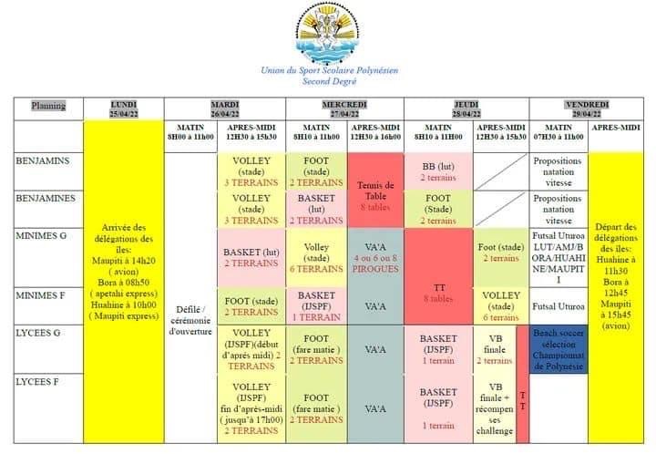 Au stade de Uturoa, du 26 au 29 avril 2022, les meilleurs sportifs sélectionnés par chaque établissement se défient dans 5 disciplines sportives :